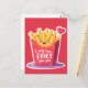 A cute and colorful cartoon illustration of a red French fries carton with a happy kawaii smiling face. The design features a floating red heart and the romantic funny pun quote "I only have FRIES for you". The image has a white sticker border, making it perfect for Valentine's Day greeting cards, fast food lovers, and humorous romantic gifts. Isolated design.