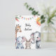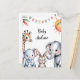 A delightful, high-quality watercolor illustration featuring a group of adorable baby safari and jungle animals. The main subjects include a sweet-faced giraffe, two chubby baby elephants with pink inner ears, and a cute bunny rabbit, all rendered in a soft, gentle art style ideal for children. The top of the frame is decorated with festive, colorful bunting flags and watercolor tropical leaves in soft green, pink, and orange tones.