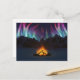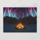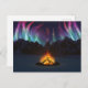 En un valle cubierto de nieve, en una noche helada en los muertos de invierno, una hoguera salta hacia arriba para reflejar las luces del norte que llenan el cielo sobre las montañas lejanas.