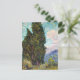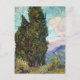 Postal de arte fino con la pintura Cypresses (1890) del artista holandés Vincent van Gogh (1853-1890). Un paisaje post-impresionista con un gran ciprés en primer plano y un cielo colorido giratorio con una luna creciente.