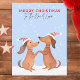 Una postal de Navidades con un ilustracion de dos preciosas dachshunds en la nieve, en un estilo acuático. El saludo 'Feliz Navidad' está en la parte superior de la carta en letras mayúsculas, seguido de 'Al que amo' en tipografía de escritura. Una postal divertida y festiva para los amantes del doxie.