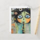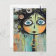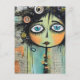 Un retrato colorido y abstracto de un capricho chica presenta un carácter estilizado con grandes ojos azules expresivos y un cabello caprichoso adornado con motivos circulares. El fondo es un collage de elementos de medios mixtos, incluyendo recortes de textos y periódicos, creando una composición vibrante y ecléctica.