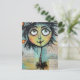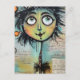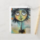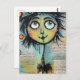 Un carácter caprichoso, con ojos grandes y expresivos y una cabecera colorida y pluvial, domina el primer plano frente a un collage de textos escritos y elementos abstractos en el fondo. La figura tiene un encanto peculiar, con sus características desproporcionadas y sus colores vivos.