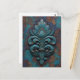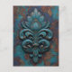 An ornate, weathered design featuring a stylized floral or fleur-de-lis shape in teal and turquoise tones, highlighted with copper and rust textures—evoking antique charm and rich decorative detail.