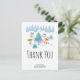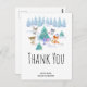 Gracias postal con una escena de bosque caprichosa. Felices animales del bosque bailando alrededor de un árbol de abeto verde con regalos debajo. Un diseño de acuarela alegre y alegre.