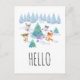 Una postal de hola con una escena de bosque caprichosa. Felices animales del bosque bailando alrededor de un árbol de abeto verde con regalos debajo. Un diseño de acuarela alegre y alegre.