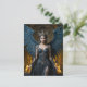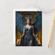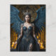 dark angel queen in a black and gold gown, adorned with a golden crown and black wings, standing in a candlelit gothic hall.