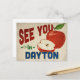 Una encantadora postal de viaje vintage de Dayton Ohio con una hermosa manzana roja, junto con un divertido texto de estilo retro que dice, "Nos vemos en Dayton"