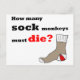 Llamando a todos los activistas del mono calcetín. Es hora de derramar las medias y difundir la noticia sobre la matanza al por mayor de monos calcetines. Este ingenioso diseño de postales presenta una imagen a mano de un calcetín marrón y rojo y la leyenda: "¿Cuántos monos de calcetín deben morir?" Esta es la postal perfecta para crear conciencia sobre el mono calcetín.