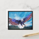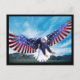 American Eagle Postcard tiene un águila volando con una bandera estadounidense sobre él en sus plumas en esta postal con blanco rojo y azul en la bandera.