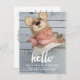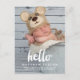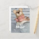 Tipografía de escritura blanca con la palabra "hola" diseño superpuesto de fotografía. Postal de anuncio de nacimiento de bebé con foto para un niño o chica. Elke Clarke © Otros colores y estilos disponibles en nuestra tienda en www.zazzle.com/monogramgallery.