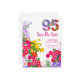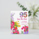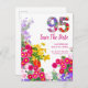 Marque la ocasión con este floral cumpleaños 95 ahorre la postal de fecha. Con coloridas flores acuáticas en rosa, morado, amarillo y verde con un audaz "95" floral, este elegante y moderno diseño es perfecto para anunciar su celebración de 75 años. Personalizable completo con los detalles de su fiesta. ¡Disfrútalo!