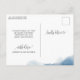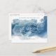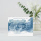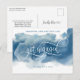 ¿Acabas de comprometerte? ¡Felicidades! Comparte con familiares y amigos tu gran noticia con esta elegante y moderna tarjeta postal de anuncio de compromiso horizontal. Hermoso diseño con mancha de acuarela azul con la frase "Me comprometí" en hermosa caligrafía manuscrita. Mancha de acuarela azul en una combinación de tonos azul polvoriento, pizarra y azul marino. Posibilidad de agregar tu propio mensaje y agregar información adicional (como información de la fiesta de compromiso o información de "guarda la fecha") si lo deseas, para agregar más líneas de texto puedes seleccionar personalizar más. Parte trasera con elementos de caligrafía manuscrita y detalle de mancha de acuarela en la parte inferior.