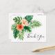 Moderno pero elegante diseño de postales Gracias boda con hojas tropicales acuarelas y flores de hibisco sobre fondo blanco.