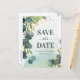 Tarjetas postales elegantes de color verde para ahorrar la fecha de la boda con un fondo desvanecido de acuarela rústica, hojas de eucalipto botánicas, salpicaduras de lámina de oro falso y una sencilla plantilla de anuncio de boda fácil de personalizar.