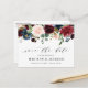 Las elegantes tarjetas postales de "Ahorre la fecha" florales son perfectas para ayudarlo a notificar a los invitados su próxima boda. La tarjeta postal elegante de "Ahorre la fecha" presenta "Guarde la fecha" en una fuente de caligrafía de moda con un borde superior de flores de acuarela rosa, borgoña y azul marino con hojas de eucalipto verde exuberantes. Personalice la tarjeta postal agregando sus nombres, dirección de devolución, detalles de la boda, sitio web de la boda, etc.