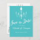 Tarjeta de aviso de boda con candelabro de salón de baile. Hermoso y sencillo candelabro blanco colgante sobre fondo aqua turquesa. Este aviso de boda coincide con nuestra colección de suites de boda con candelabros.