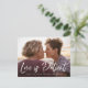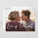 ¿Necesitas posponer la fecha de tu boda? Nuestras modernas tarjetas postales de postergación de boda son perfectas para notificar a tus invitados la nueva fecha. La elegante tarjeta postal presenta "El amor es paciente" en una superposición de escritura a mano con tu foto de compromiso horizontal. Personaliza la tarjeta agregando tus nombres, dirección de devolución, detalles de la boda, sitio web de la boda, etc.