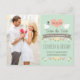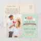 Agregue la fecha numérica de su boda en el corazón de esta tarjeta de "ahorren la fecha" de boda con tema de dulces aves de amor con dos palomas blancas, una con un sombrero gris de novio y la otra con un velo floral de novia sobre un fondo de jade claro verde menta. La pancarta marrón dice "Para el matrimonio de" pero puede cambiar la redacción si hace clic en el botón de personalizar. Flores blancas en ramas de árboles, corazones de color coral, flores rosadas y marrones y un diseño de rosa amarilla y tulipán forman la guirnalda de laurel. AGREGUE SU DIRECCIÓN DE ENVÍO Y UN MENSAJE ESPECIAL AL REVÉS DE LA TARJETA POSTAL PARA SUS INVITADOS EN EL FONDO QUE PARECE PERGAMINO. Arte © Chrissy H. Studios, LLC. Todos los derechos