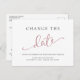 Haga saber a sus invitados que la fecha de su boda ha cambiado con esta tarjeta postal de cambio de fecha de boda de rosa, negro y blanco, chic y simple. "Cambia la" está escrita con una tipografía clásica negra elegante y "fecha" en una escritura contemporánea de rosa, y debajo puede personalizar sus nombres y su nueva información de fecha de guardado. En el reverso, puede personalizar su mensaje con más detalle.