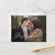 Tarjetas postales de aplazamiento de boda elegantes y con estilo que muestran su foto de compromiso horizontal favorita con "Aplazado" en una superposición de escritura de caligrafía moderna blanca. Personalice la parte frontal de la tarjeta de cambio de planes de foto agregando sus nombres y redacción de aplazamiento de boda. La parte posterior de la postal presenta su dirección de devolución, nombres, sitio web de boda, etc.