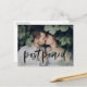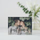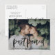 ¿Necesita cambiar la fecha de su boda? Nuestras elegantes tarjetas postales de aplazamiento de boda son perfectas para notificar a los invitados su nueva fecha de boda. La tarjeta postal de cambio de fecha presenta "pospuesto" en una superposición de letra de pincel manuscrita en negro con su foto de compromiso horizontal. Personalice la postal agregando sus nombres, dirección de devolución, detalles de la boda, sitio web de la boda, etc.