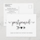 Permita que sus invitados sepan que la fecha de su boda se ha pospuesto con este elegante anuncio de aplazamiento de boda moderno. "pospuesto" está escrito con tipografía elegante y debajo, apuntando a un futuro de amor, hay una flecha y un corazón. Puede personalizar sus nombres y el anuncio de aplazamiento en la parte delantera y proporcionar más detalles en el reverso, como una nueva fecha o si habrá una nueva fecha cuando la tenga.