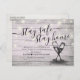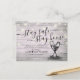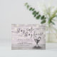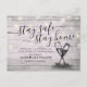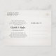 Tarjetas de anuncio de boda moderna con plantillas de postales para aplazamiento - Letra elegante de escritura, copas de champán vintage y luces de cuerda sobre fondo de madera rústica.