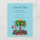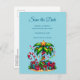 Guarde la postal de fecha con una imagen de vacaciones de temporada. Una palmera tropical adornada con luces festivas y una estrella en la parte superior. Un enorme bastón de caramelo rojo y blanco saliendo de la arena. Regalos de Navidad debajo del árbol. Genial y divertido.