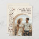 Avise con anticipación a sus seres queridos de su próxima boda con esta hermosa postal de "save the date". El diseño boho chic de color crema rústico y mocha presenta su foto en un marco en forma de arco con un ramo de delicadas flores silvestres a lo largo de un lado en tonos terrosos de arcilla de terracota, rosa polvoriento y azul peltre. Las palabras "Save the Date" están escritas en la parte superior en letra de escritura moderna. Hay espacio para sus nombres, la fecha y el lugar de la boda. La parte trasera tiene espacio para una breve nota y firma. ¡Hermoso comienzo de su viaje de bodas!