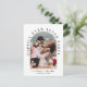 Anuncio de boda moderno y elegante o tarjeta postal de invitación para una boda íntima o recepción para informar a familiares y amigos que se casaron en una pequeña ceremonia de boda, y para invitarlos ahora a una recepción de boda. La parte delantera presenta la foto de su boda en un marco arqueado y "Fiesta de feliz para siempre" en tipografía elegante. Debajo de su foto puede agregar sus nombres y la fecha de la boda. En el reverso puede personalizar su mensaje con más detalle y agregar los detalles de la fiesta o recepción y sus nombres en una escritura con apariencia de firma.
