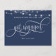 ¿Acabas de comprometerte? ¡Felicidades! Comparte con familiares y amigos tu gran noticia con esta elegante tarjeta postal de anuncio de compromiso simple. Fondo azul marino con luces de cuerda románticas en la parte superior y la frase "Me comprometí" en hermosa caligrafía blanca a mano. Posibilidad de agregar tu propio mensaje y añadir información adicional (como detalles de la fiesta de compromiso o información para guardar la fecha) si lo deseas, para agregar más líneas de texto puedes seleccionar personalizar más. Parte trasera con elementos de caligrafía a mano y borde azul marino en la parte superior con detalles de luces de cuerda.