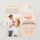 Agrega la fecha numérica de tu boda en el corazón de esta tarjeta de guardar la fecha con tema de aves de amor con dos palomas blancas, una con un sombrero gris de novio y otra con un velo floral de novia sobre un fondo ROSADO CORAL PÁLIDO. La pancarta marrón dice "Para el matrimonio de" pero puedes cambiar el texto si haces clic en el botón de personalizar. Flores blancas en ramas de árboles, corazones de color coral, flores rosadas y marrones y un diseño de rosa amarilla y tulipán forman la guirnalda. AGREGA TU DIRECCIÓN DE ENVÍO Y UN MENSAJE ESPECIAL AL REVÉS DE LA TARJETA POSTAL PARA TUS INVITADOS EN EL FONDO QUE PARECE PERGAMINO. Arte © Chrissy H. Studios, LLC. Todos los derechos reservados.
