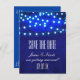 Blue Rustic Night String Lights Save Date Postcard. Personalizar con cualquier texto.