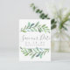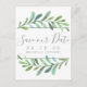 Una elegante boda botánica salva la postal de fecha bordeada por viñas de color azul-verde. El color de fondo se muestra en blanco, pero se puede personalizar para que coincida con el tema boda.