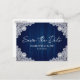 Boda rústica de campo azul marino salva la postal de fecha con elegante encaje floral contra un fondo de madera azul marino.