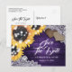 La boda rústica y personalizada de morado y girasol salva las postales de fecha con girasoles y eucalipto sobre un fondo de madera de granero adornado con corazones de burrega, encaje floral blanco y luces de cuerdas. Diseño de tarjetas ideal para tu campo rústico morado, patio trasero o fiesta de bodas en granero inspirada en flores de girasol. Elementos coincidentes disponibles.