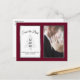 Pida a sus invitados que guarden la fecha de su boda con este diseño simple y elegante que presenta su foto, letra moderna, texto negro y un árbol de Navidad plateado con estrellas enmarcado en plata metálica sobre un fondo borgoña. Personalícelo con su foto, fecha de la boda, nombres y ubicación en la parte delantera junto con su mensaje, nombres y dirección de devolución en la parte posterior.