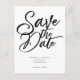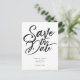 Felicidades por su compromiso! Impresione a los invitados con esta elegante tarjeta de guardar la fecha. Este diseño presenta un estilo minimalista en blanco y negro con una fuente de letra tipográfica en el centro que dice "guardar la fecha". Personalice este producto agregando su propia información de boda.