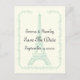 Boda de París Torre Eiffel verde de la menta Guardar la postal de la fecha. Un diseño elegante y elegante, lleno de clase y finura, con la Torre Eiffel en verde menta y un borde damasco sobre fondo marfil. Este diseño de plantilla personalizado es totalmente personalizable y forma parte de un conjunto boda perfecto para un boda parisino de primavera o verano.