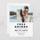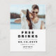 Una divertida y moderna tarjeta postal de "BEBIDAS GRATIS Y UNA BODA DE REGALO" para anunciar la fecha de la boda. El diseño presenta tipografía moderna en color negro sobre fondo blanco y tiene espacio para una foto en orientación horizontal. En el reverso de la tarjeta postal, el diseño ofrece opciones para más detalles, incluyendo espacio para una dirección de respuesta. Personalice el diseño reemplazando el texto y la foto de muestra. Están disponibles más estilos en nuestra tienda.