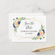 Estas tarjetas de guardar la fecha presentan un diseño floral de acuarela con flores blancas, coral y azul marino y un borde geométrico dorado falso. Personalice el texto con su propio texto.