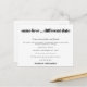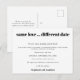 Cuando la situación desafortunadamente significa que necesitas cambiar la fecha de tu boda, una postal conveniente te permitirá informar a tus invitados de tu nueva fecha lo antes posible. Este diseño tipográfico minimalista en blanco y negro es totalmente personalizable. Personaliza fácilmente el texto en la parte delantera y trasera. También puedes cambiar los estilos de fuente y colores y colores de fondo si lo deseas a través de la opción personalizar más. Si necesitas ayuda, por favor envíame un mensaje.