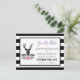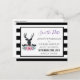 Una tarjeta postal de guardar la fecha de boda con una cabeza de ciervo negra con grandes cuernos. Líneas geométricas dentro de la cara del ciervo agregan un toque creativo. Flores rosadas coloridas y hojas verdes menta forman un bonito ramo floral debajo de su cabeza. Un boceto de una cordillera colocado entre las flores también agrega al ambiente rústico de campo. El fondo es un patrón de rayas negras y blancas.