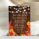 Madera marrón rústica con luces de cuerda la boda ahorra la fecha con naranja pintado a mano y hoja roja, flores, ramas de trigo ramo y calabazas naranjas en una madera marrón vintage y elegante tipografía caligráfica. Perfecto para los bodas del otoño. Perfecto para los temas de campo, boda de granero.