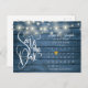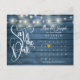 Esta elegante tarjeta de save the date cuenta con hermosas luces de cadena, un calendario y un corazón de amor dorado elegante que destaca su fecha especial en un fondo de madera rústica azul.