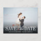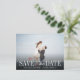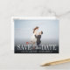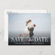 El diseño de la tarjeta postal de anuncio de guardar la fecha de la boda elegante presenta una foto de compromiso horizontal de cuadro completo con "guardar la fecha" en una combinación elegante de fuente serif y script. Incluye el texto en el anverso y reverso de la tarjeta postal que se puede personalizar con todos los detalles importantes.