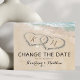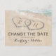 Tarjeta postal de cambio de fecha de boda en destino de playa con fondo de isla tropical veraniega, una playa de arena vintage con dos corazones en la orilla, tus iniciales y una plantilla de texto editable.