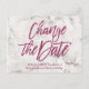 Anuncio elegante de posposición de boda o cambio de fecha con una letra de moda que dice "Cambia la fecha" en brillo rosa brillante de moda sobre un fondo de mármol blanco y gris clásico.Para solicitudes personalizadas, por favor escriba a citronelladesign@gmail.com