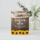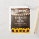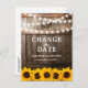 Tarjeta postal de cambio de fecha de girasol con fondo de barril de roble campestre, luces de hadas, girasoles amarillos dorados, tu monograma y una plantilla de guardar la fecha. Encuentra otras tarjetas de cambio de planes en www.zazzle.com/special_stationery.